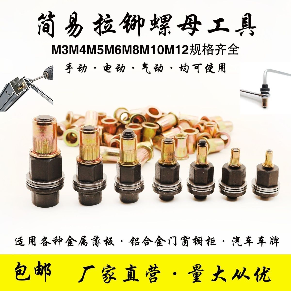 主营:拉母头、铆螺母头、简易拉铆螺母工具头、压铆螺母、压铆螺钉、压铆螺柱、不锈钢拉铆螺母、拉铆螺母、六角铆螺母
